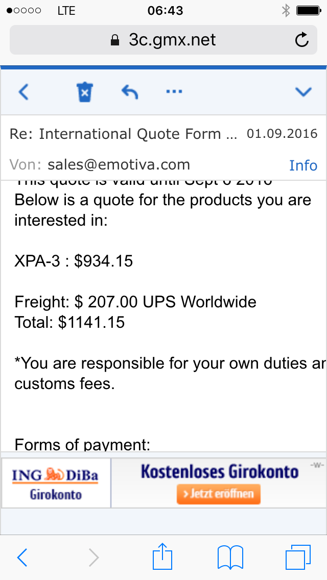 Parallel gab es immer die Möglichkeit, per Mail an Emotiva direkt zu ordern. Dann musste man sich um die Zollangelegenheiten selbst kümmern.