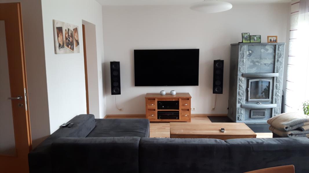 So da sind Bilder einmal nach hinten raus (da sieht man z.B. unter dem einen Bild einen der beiden hinteren Lautsprecheranschlüsse und rechts einen Surround-LS) und einmal nach vorne. Von der Sitzposition nach hinten sind es ca. 3,4m und nach vorne 3m.