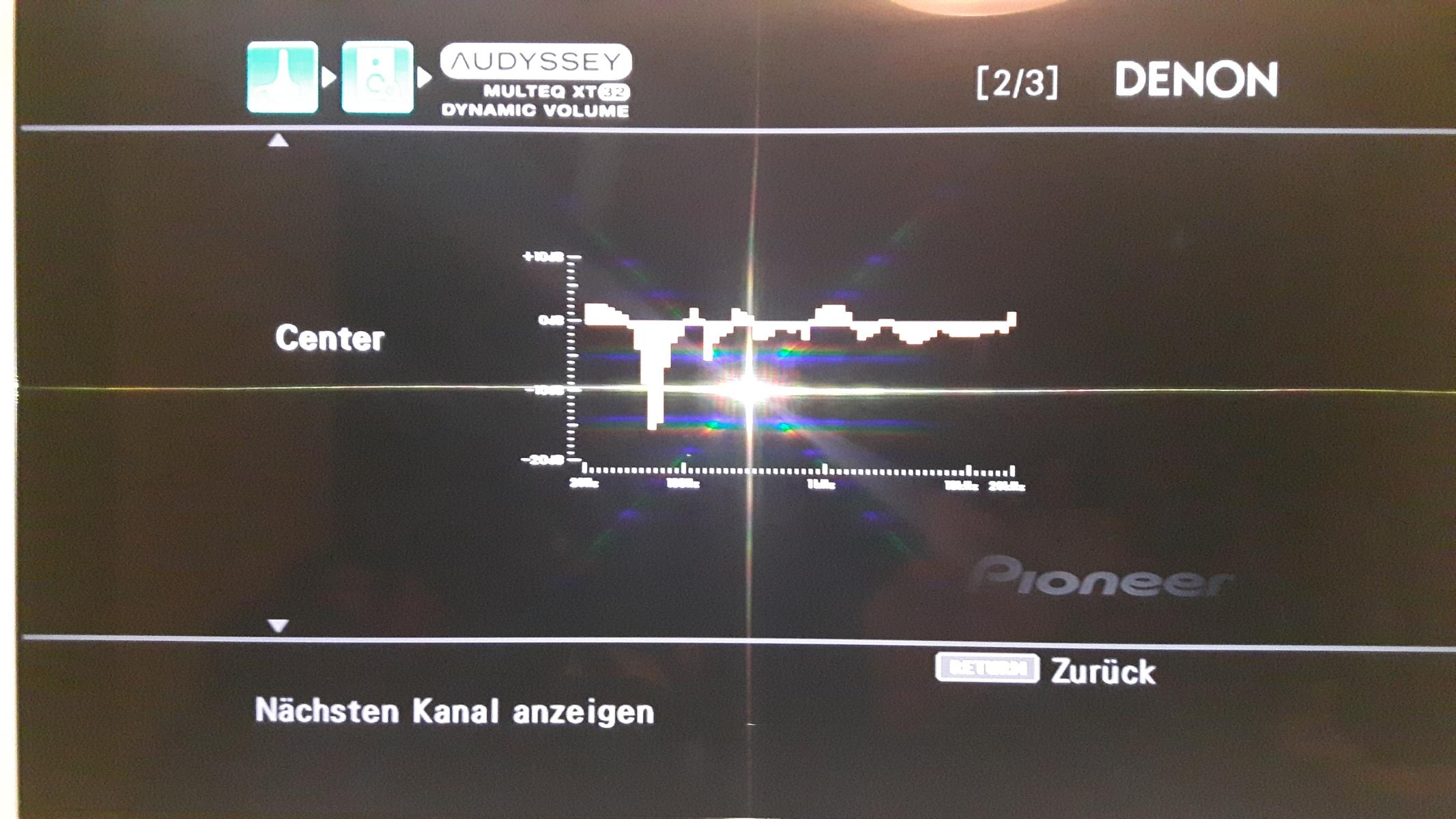 Man sieht das Eingreifen des Denon bei der Front am Bild 1/2 deutlich. Wenn du an der unteren waagerechten Ache ganz links schaust, ist dort der Frequenzbereich unter 100 Hz erkennbar. Und wenn man oben die waagerechte Linie sieht, dann ist das die für 0 dB, d.h. dort wird keine Pegeländerung vorgenommen.