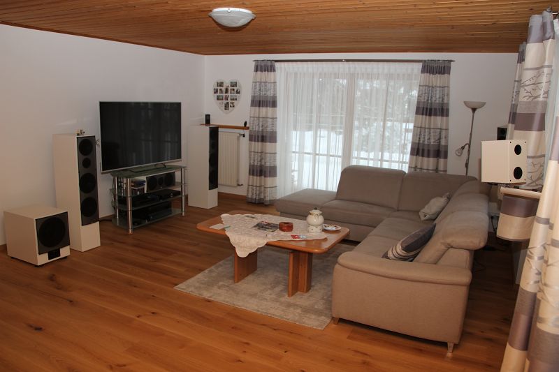 Nun bin ich zwar grundsätzlich mit dem Setup zufrieden, aber was die Raumakkustik angeht, muss ich das endlich mal angehen - natürlich dröht es und auch sonst ist nicht alles ganz ok. Letztes Jahr im Oktober haben wir das Wohnzimmer renoviert, neuer Parkettboden (nun geklebt), neue Vorhänge und neue Couch. Die Aufstellung ist weitgehend gleich geblieben, wurde nur auf die neue Couch neu ausgemittelt. Zudem hängen die Surroundboxen nun auf den hübschen Wandhaltern von Nubert. Bevor ich nun loslege, erst mal einige Bilder: