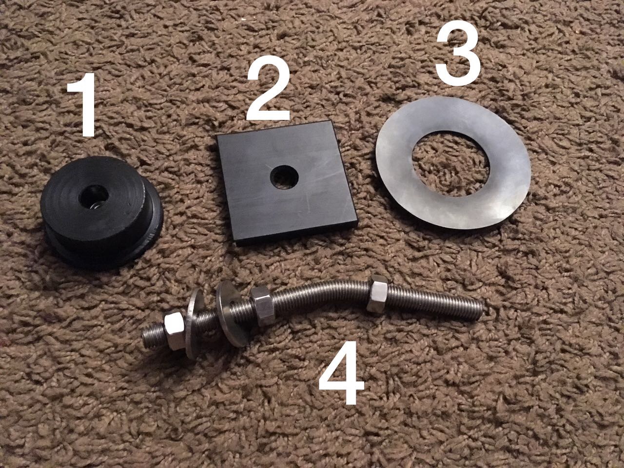1- auf der Drehbank gefräster Stöpsel mit Kragen und M12 Mutter Rückseitig eingepresst der ins Gehäuse eingesetzt wird, anstelle des Bassreflexrohrs, ( werde bei 100HZ trennen ) und mittels Gewindestange (4) und einer großen ca 75x75 x12 mm U-Scheibe (2) auch aus PE 100 , quadratisch , gekontert .