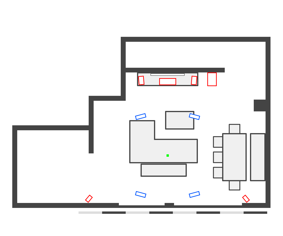 - Ein Großteil der Rückwand besteht aus Tür / Fensterfronten, hier wäre nur eine Montage in nahezu Deckenhöhe bzw. an der Decke möglich.