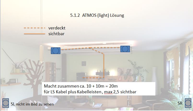 Das erste Bild wäre natürlich die Sahnesituation mit voller Atmos, DTS-X und Auro Kompatibilität, während das 2. Bild die diskrete 2 Kanal (nur) Atmos-Lösung zeigt. Letztere könnte ich vielleicht noch geschickt ins Deckensegel integrieren und hätte kaum sichtbare Kabelleisten (nur einmal an der Frontwand hoch und 1,5m an der Decke entlang). Gut, ich müsste noch zwei weitere Deckenhaken einbohren, damit das Segel wegen dem Mehrgewicht nicht einseitig runterhängt, aber das ließe sich ja machen. Falls jemand auf den Bildern die Nuline 284 und AW1100 vermissen sollte... die sind vom Textfeld überdeckt und stehen rechts und links form WoZi Schrank.