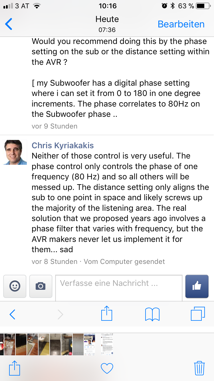 [ bei #2 und #3 werden wir auch gegenmessen ob ein nachträgliches Verändern der Phase am Sub den von Audyssey optimierten Frequenzgang oder das Delay beeinflusst ( sollte wohl so sein da die geänderte Phase die Laufzeit verschiebt ... )