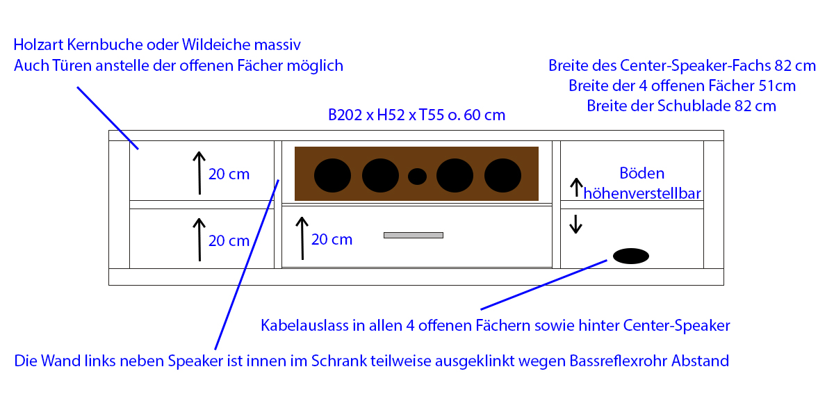 Eine Skizze hierzu habe ich mal beigefügt. Ggfls. werde ich die Maße noch etwas verändern. Auf alle Fälle wird der TV-Schrank etwas höher als der alte, damit auch der Center etwas mehr Höhe hat. Um den Center zusätzlich noch etwas nach oben angewinkelt stellen zu können (wegen Abstrahlwinkel zum Höhrplatz), muss das Center-Speaker-Fach evtl. noch etwas höher werden.