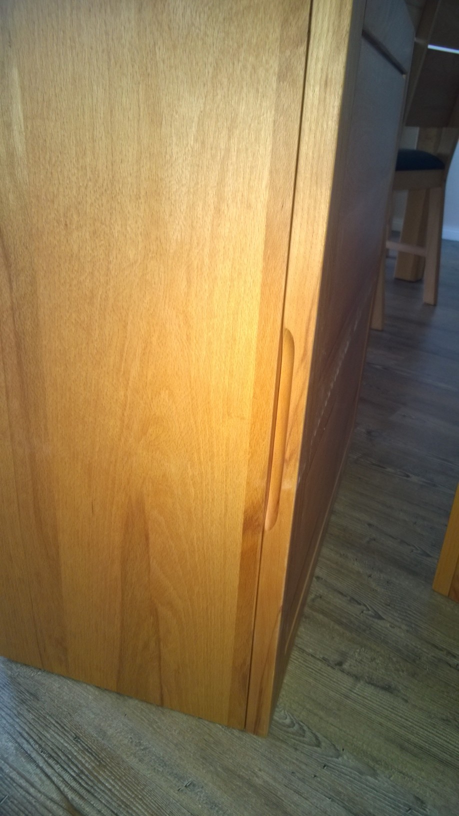 Die Klappe beim TV-Schrank ist natürlich dann aus Holz (Kernbuche oder Wildeiche) und geht von oben nach unten auf, also umgekehrt wie bei der Hängevitrine mit Glastüre.