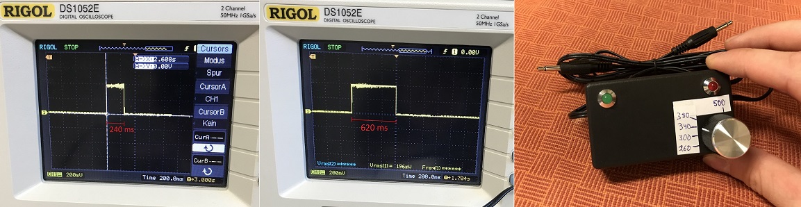 Das Ausgangssignal meiner Schaltung habe ich mithilfe eines Oszilloskops auf das gewünschte Verhalten hin überprüft. Markierungen auf der "Triggerbox" helfen beim Einstellen der gewünschten Impuls-Dauer über ein Potentiometer. Die grüne LED leuchtet dauerhaft bei Anliegen der konstanten AVR-Triggerspannung. Die rote LED bildet den Impuls ab und leuchtet für die eingestellte Dauer auf nachdem der AVR eingeschaltet wird.