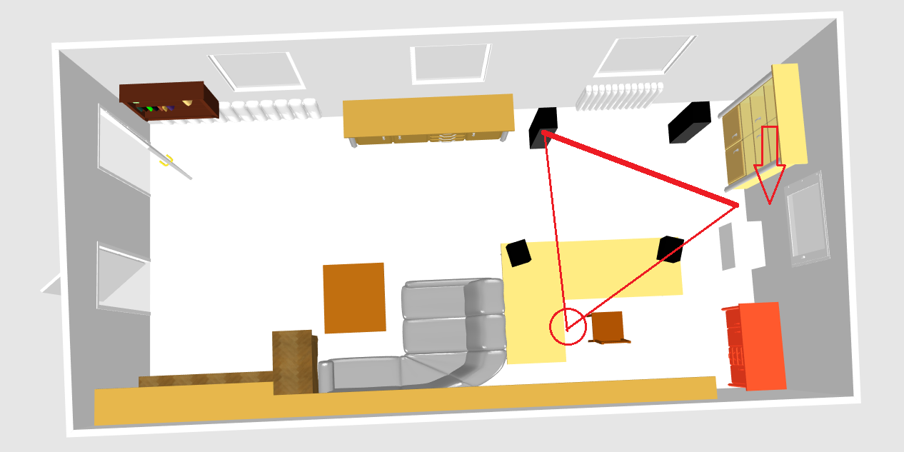 Laut Raummodenrechner bei ca 41,5 und bei 43 Hz, diese sind wirklich überdeutlich zu hören. Insbesondere an meiner Hörposition, dem abgebildeten Stuhl und in der Nähe der Ecken/Wände. Der Sound hat was von Großraumdisco, bei der man in der falschen Ecken steht.