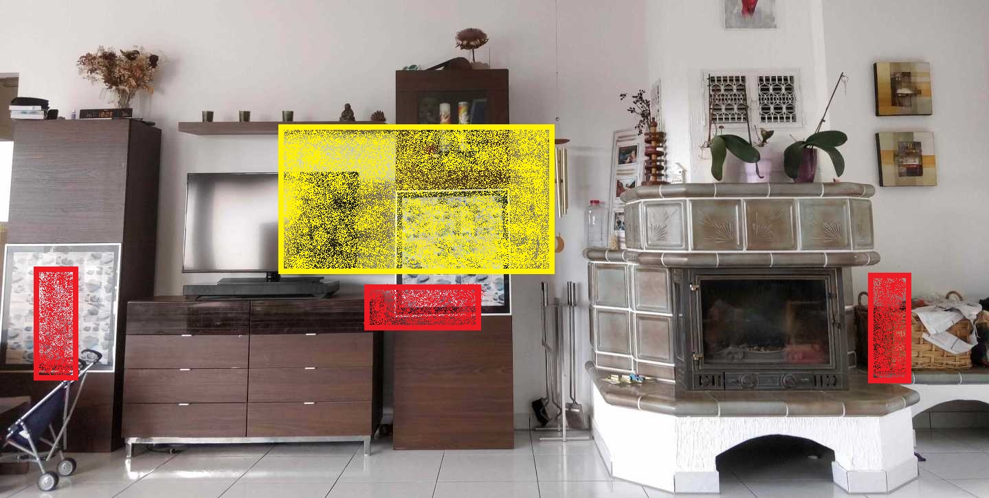 Ich weiß nicht, ob es überhaupt möglich ist, direkt am Kamin (ich meine über den Kacheln) Lautsprecher zu befestigen. Falls ja, dann wärst du natürlich schon etwas hoch. Ggf. leicht nach unten angewinkelt wäre das aber vielleicht durchaus möglich. Hier würde ich so weit wie möglich nach vorne (Richtung Couch) gehen, um seitliche Reflexionen (am Kamin) soweit wie möglich zu vermeiden. Auf der anderen Seite wäre natürlich die Frage, wohin mit dem linken Lautsprecher. Wenn das Möbel auf der linken Seite eventuell in die Höhe ginge, könnte man hier vielleicht den L-Speaker reinstellen oder anderweitig montieren, soweit nach vorne wie möglich.