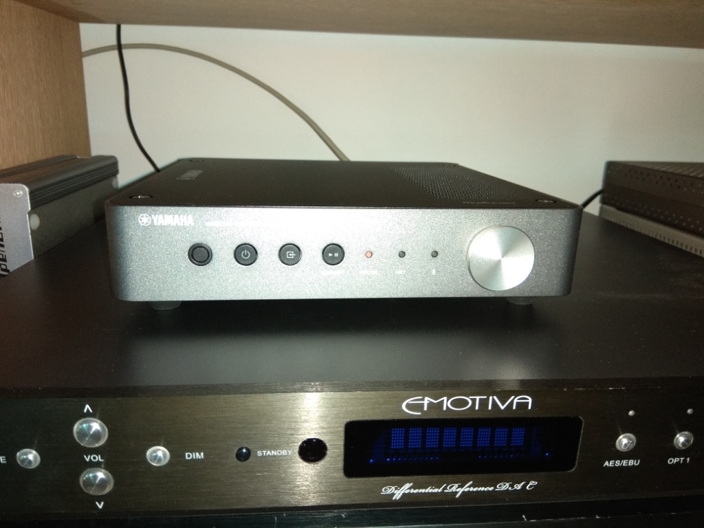 Natürlich würde ein verlustbehaftetes Streaming auch reichen, doch der Freak in mir weigerte sich. Möchte man doch einmal eine CD mitschneiden, landet sie nur als MP3 auf dem NAS. So sah ich mir das Angebot an alternativen Diensten an. Deezer schied aus, bei Tidal sagte mir das Musikangebot nicht zu. So blieb nur Qobuz übrig, was gleich das nächste Problem mit sich brachte: Wie bringt man das verlustfreie Format verlustfrei auf die Anlage? Der vorhandene Pioneer N-30 kann damit noch nichts anfangen und die Hersteller, die Qobuz unterstützen, sind noch sehr dünn gesät. Als einer der Bigplayer fiel mir Yamaha mit diversen Geräten auf und zufällig hatte Nubert beim "Rrrausverkauf" den WXC-50 gelistet: Das kleine Gerätchen besitzt ein solides Metallgehäuse und kann neben der Streamingfunktion auch als Vorverstärker-DAC genutzt werden. So lassen sich externe Geräte via Toslink oder analog anschließen, die Vorverstärkersektion kann man aber auch komplett deaktivieren. Wenn meine XSP-1 wieder da ist (mittlerweile fast 3 Monate in Reparatur!), wird der Yamaha als reiner Streamer weiterbetrieben.