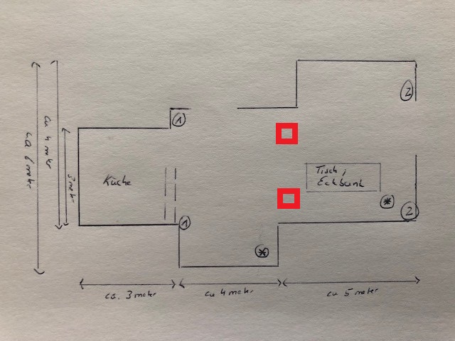 Zu allen Positionen ist zwar Strom in Reichweite, aber keine Boxenkabelverlegung möglich (auch keine Verbindung der Boxen)