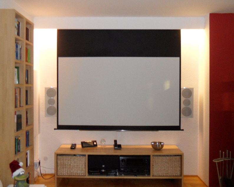 Das ganze habe ich im Wohnzimmer verbaut und die Leinwand hinter einer Lichtblende versteckt, die eine olle, alte Stehlampe ersetzt.