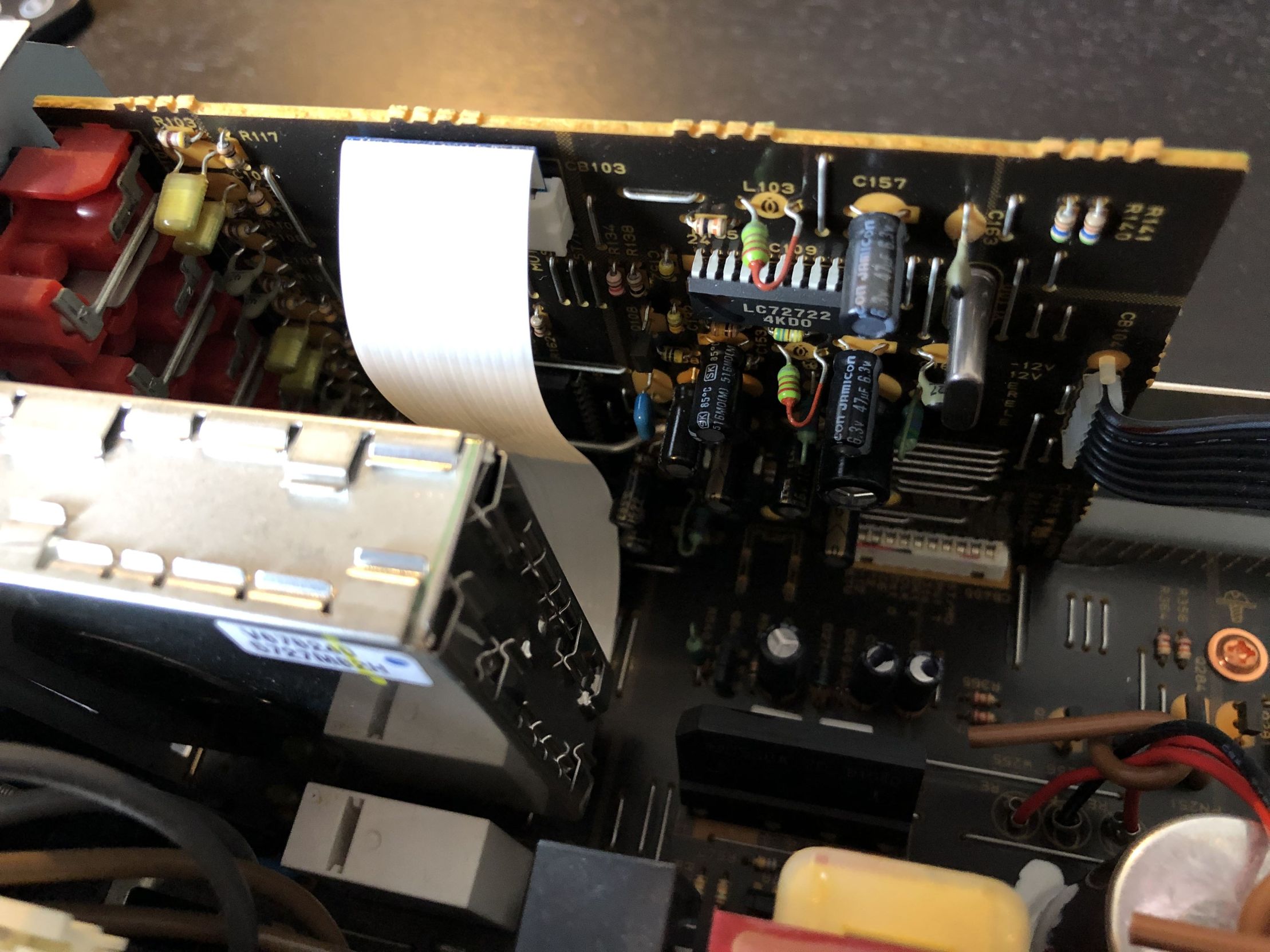 Kabelbrücken eingebaut und verlötet. Es handelte sich um geschirmte Kabel bei denen ein Stück Schrumpfschlauch über die abgeschnittene Schirmung drübergesteckt wurde um einen Kurzschluss zu vermeiden. Der Lötkolben hatte leider eine zu dicke Spitze, daher sieht das Lötergebnis nicht ganz profihaft aus.