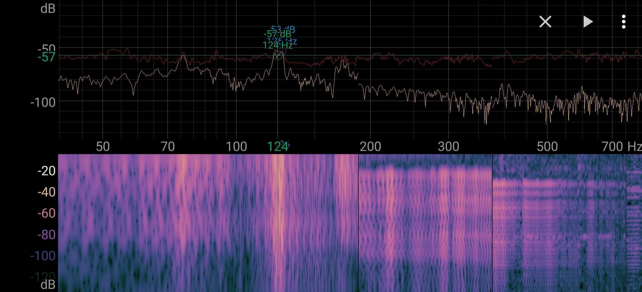 Das zweitdominanteste Nachschwingen liegt bei 125 Hz. Da ich es keiner Raummode wirklich gut zuordnen konnte, habe ich zuerst mal meinen Schreibtisch "abgeklopft", ob dieser bei der Frequenz eine Resonanz hat (insbesondere, weil die Resonanz bei der Messung mit Kissen auf dem Schreibtisch geringfügig schneller abgeklungen ist) aber ebenfalls Fehlanzeige. Da auch bei der Messung mit zugezogenem Vorhang eine minimale Verbesserung sichtbar war, habe ich noch das Fenster abgeklopft und bin tatsächlich fündig geworden - die Scheibe schwingt mit einwandfreien 125 Hz: