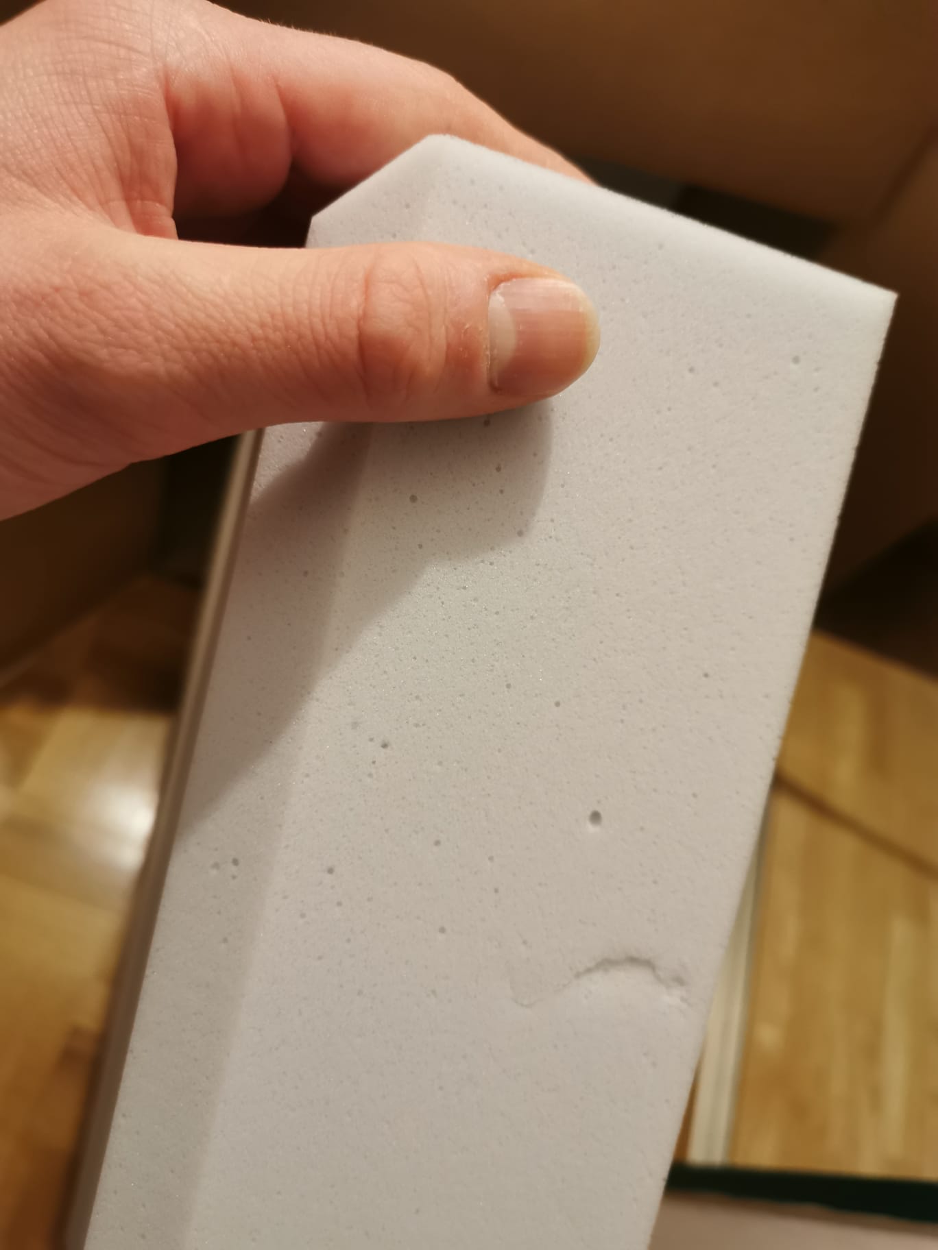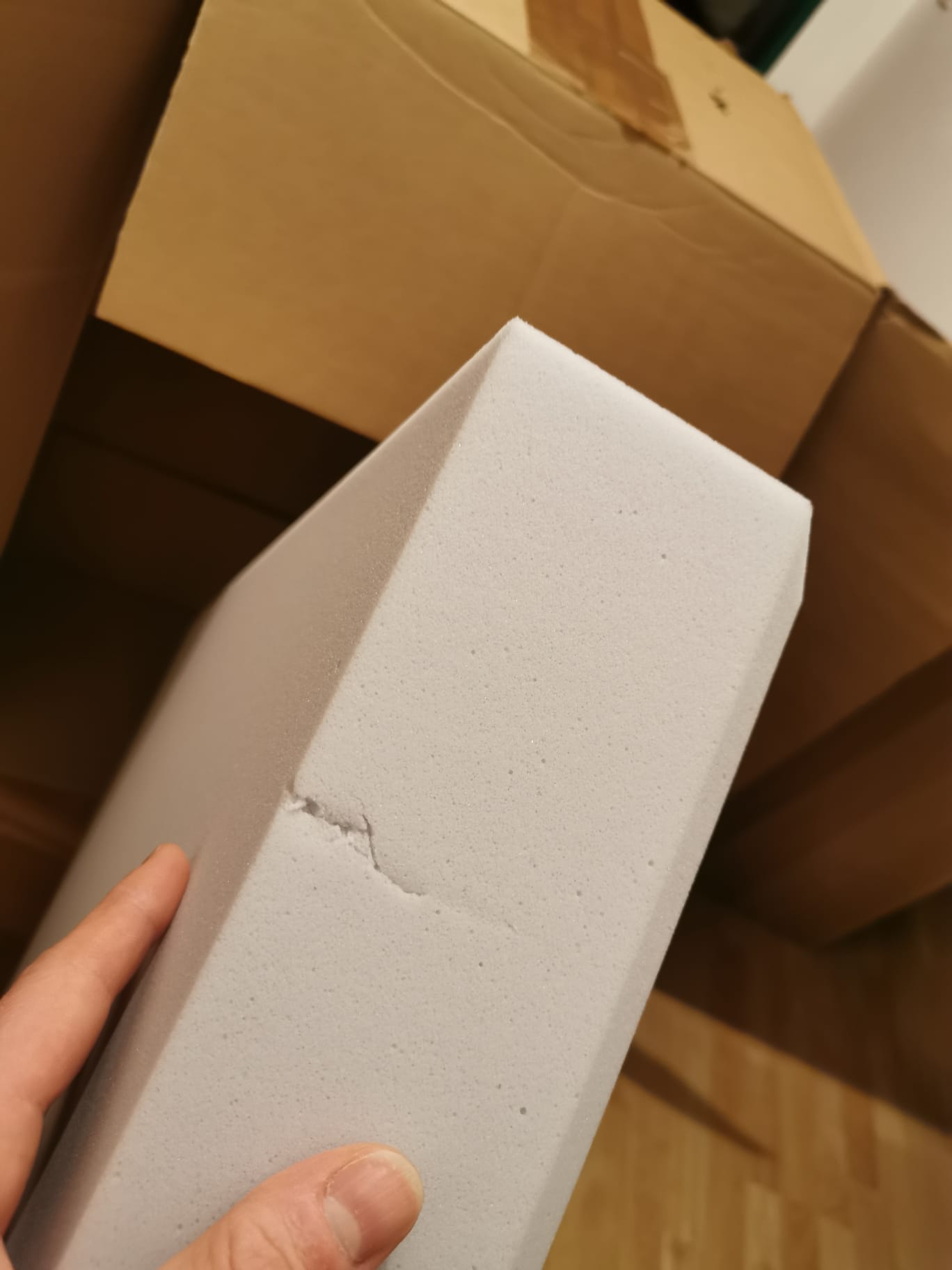 Heute ist auch bereits die erste Teillieferung an Platten eingetroffen - leider haben beide im Paket enthaltenen Platten einen kleinen Transportschaden erlitten. Nichts wirklich Dramatisches, aber wenn man schon 30 € für einen schnöden grauen Schaumstoffquader hinlegt, ist es dennoch irgendwie ärgerlich, muss doch nicht sein