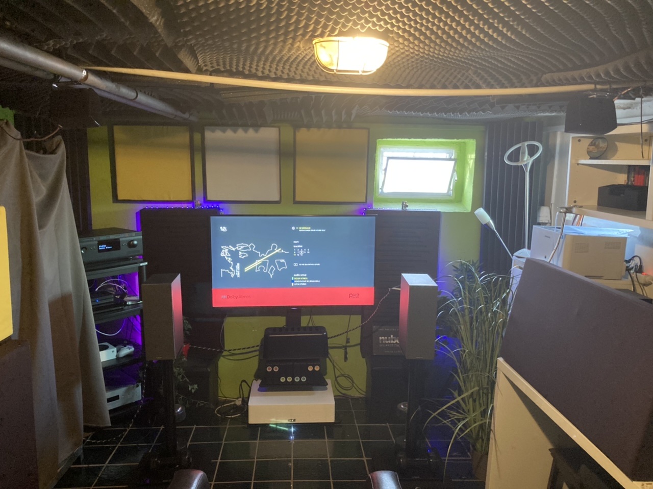 Ich hoffe man erkennt meine Atmos Idee, bohren will ich nicht, ich habe aber das Kupferrohr, samt Schellen und die leichten Boxen kann man mit Kabelbindern aufhängen, dank des Bügels kann ich die LS auch einwinkeln.