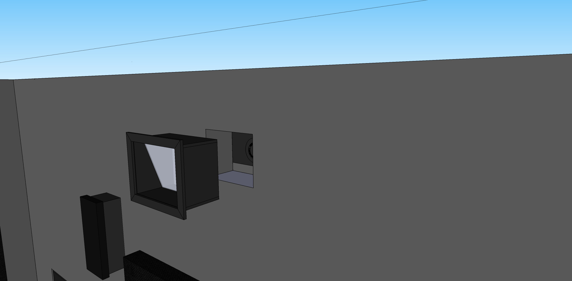 Der Projektor wird in einem separaten Technikraum untergebracht und scheint durch eine Scheibe. So sind sämtliche Nebengeräusche eliminiert. Und irgendwie muss die Scheibe ja eingebaut werden. Der fertige Kasten wird dann in die Trennwand eingebaut.