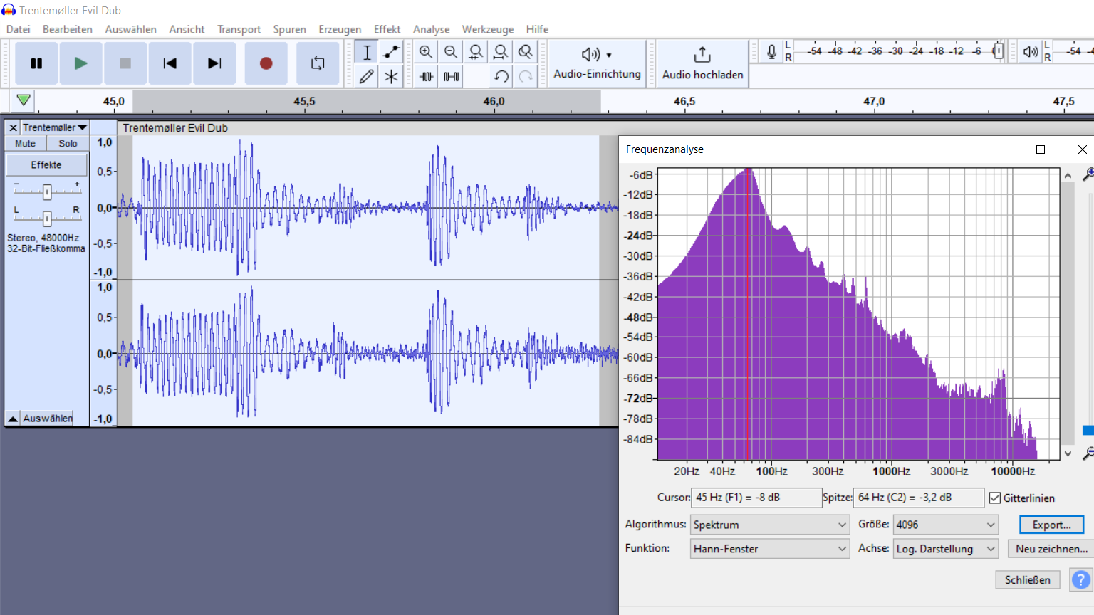 ja eh, aber ich hör' da keinen Tiefbass, mehr als -30dB unter der dominanten 65Hz Basslinie sind weniger als ein Tausendstel der Schallintensität, bereits die sekundäre Linie mit etwa -8dB bei 44Hz ist im Spektrogramm kaum noch zu erkennen und mit einem Sechstel der Intensität für mich nur noch zu erahnen ...