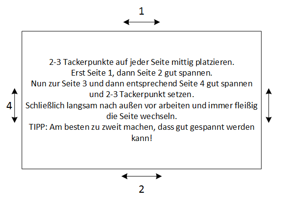 Beim Bespannen hilf u.U. folgendes Bild: Im Prinzip rennt man wie wild um den Rahmen, weil man die Klammern abwechselnd auf den Seiten von Innen nach außen setzt.