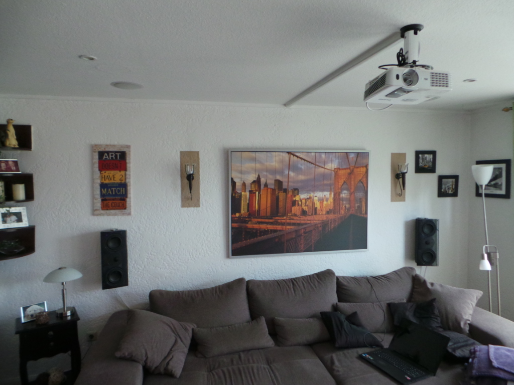 Sieht doch gut aus mit den 50 er u. 5 er an der Wand. Wie machst du das mit der Leinwand, sind die Boxen nicht dahinter?
