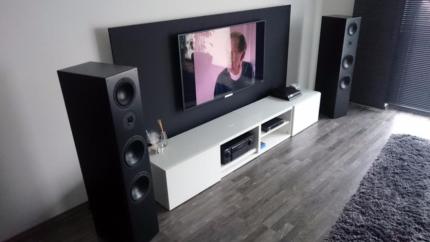Wie schon geschrieben, dritte nuJu statt CS-413. Die nuJu ist mit einer nuBase 38 angewinkelt. Jetzt stellt sich die Frage, wie ich den Fernseher aufstelle. Vorher stand der ja auf dem CS-413. Habe mir erstmal provisorisch einen Ständer aus MDF (Materialkosten 3-4€) gebastelt. Den Fernseher möchte ich eigentlich nicht an die Wand hängen. Eine andere Möglichkeit wäre, den AVR nach rechts zu schieben und die nuJu in die Mitte des Lowboard zu stellen. Angewinkelt würde sie dann so gerade direkt über die Kante des Tisches auf meine Kopfhöhe strahlen (sofern ich in dem höheren Stuhl sitze, habe da 2 zur Auswahl). Habe aber etwas Sorgen, dass sich das klanglich nachteilig auswirkt. Zumal der Center dann auch ein gutes Stück tiefer als die beiden Fronts wäre, wenn auch angewinkelt.