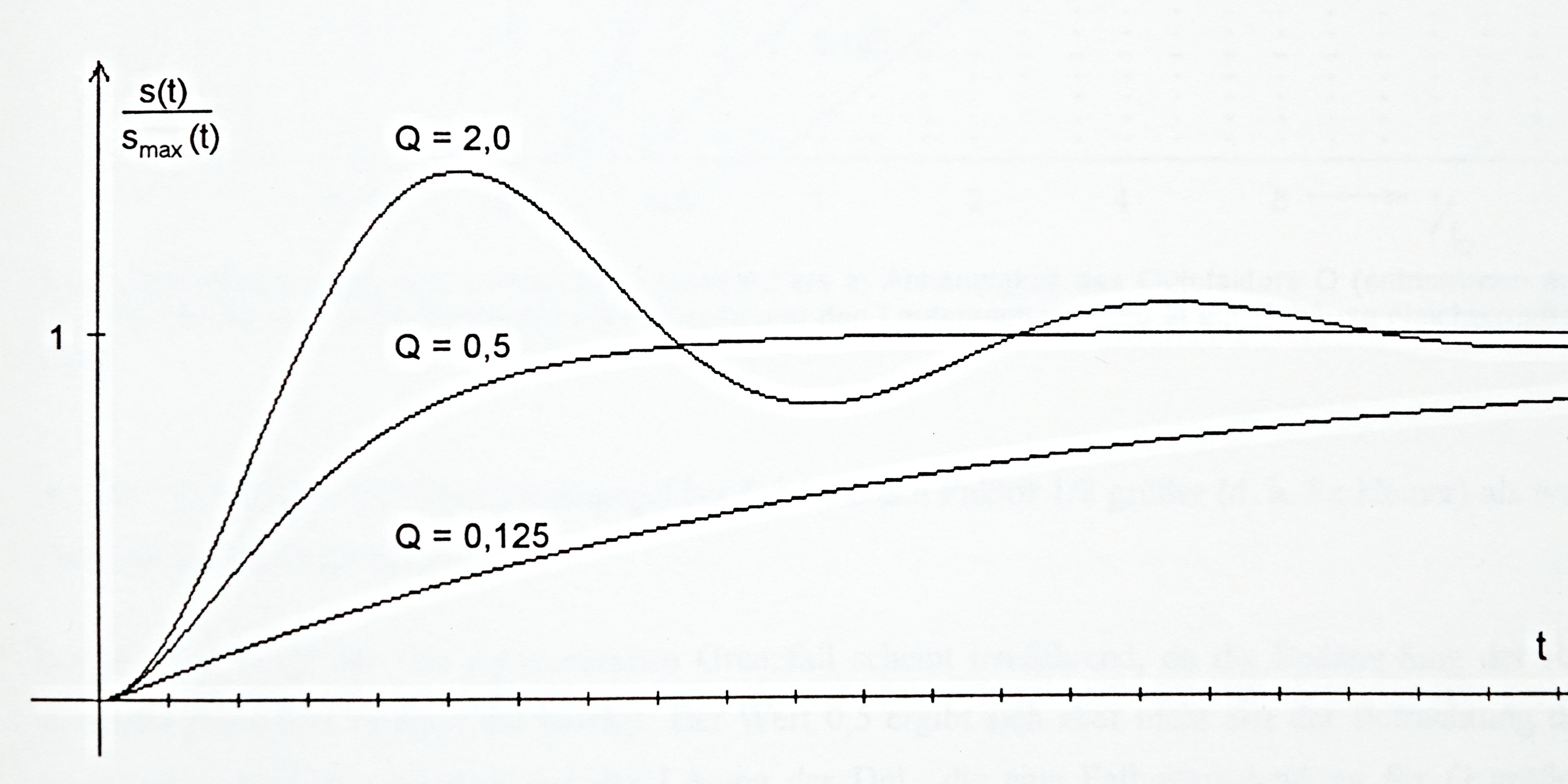 Ja, richtig. Die Membrane bleibt bei einem Sprungsignal ausgelenkt. Zum besseren Verständnis stelle ich hier die Sprungantwort der Membranauslenkung dar:Wete hat geschrieben: Di 15. Feb 2022, 19:35Die elektrische Darstellung des Signals verstehe ich. Die Darstellung dessen, was Sie als "Beschleunigung" der Membran bezeichnen, hingegen nicht. Müsste die Membran bei diesem elektrischen Signal nicht ausgelenkt bleiben (es handelt sich bei einer unendlich tiefen Frequenz ja um eine Gleichspannung, wenn die unendlich steile Flanke angestiegen ist)? Das Abfallen, das sich dann zum Unterschwinger weiterentwickelt, zeigt doch den Rückkehr der nicht angetriebenen Membran zum Nullpunkt (und etwas darüber hinaus), oder? Diesen Teil habe ich noch nicht verstanden.TBien hat geschrieben: Di 15. Feb 2022, 18:09 Die Sprungantwort kann man sich als ein Rechtecksignal mit unendlich tiefer Frequenz vorstellen.