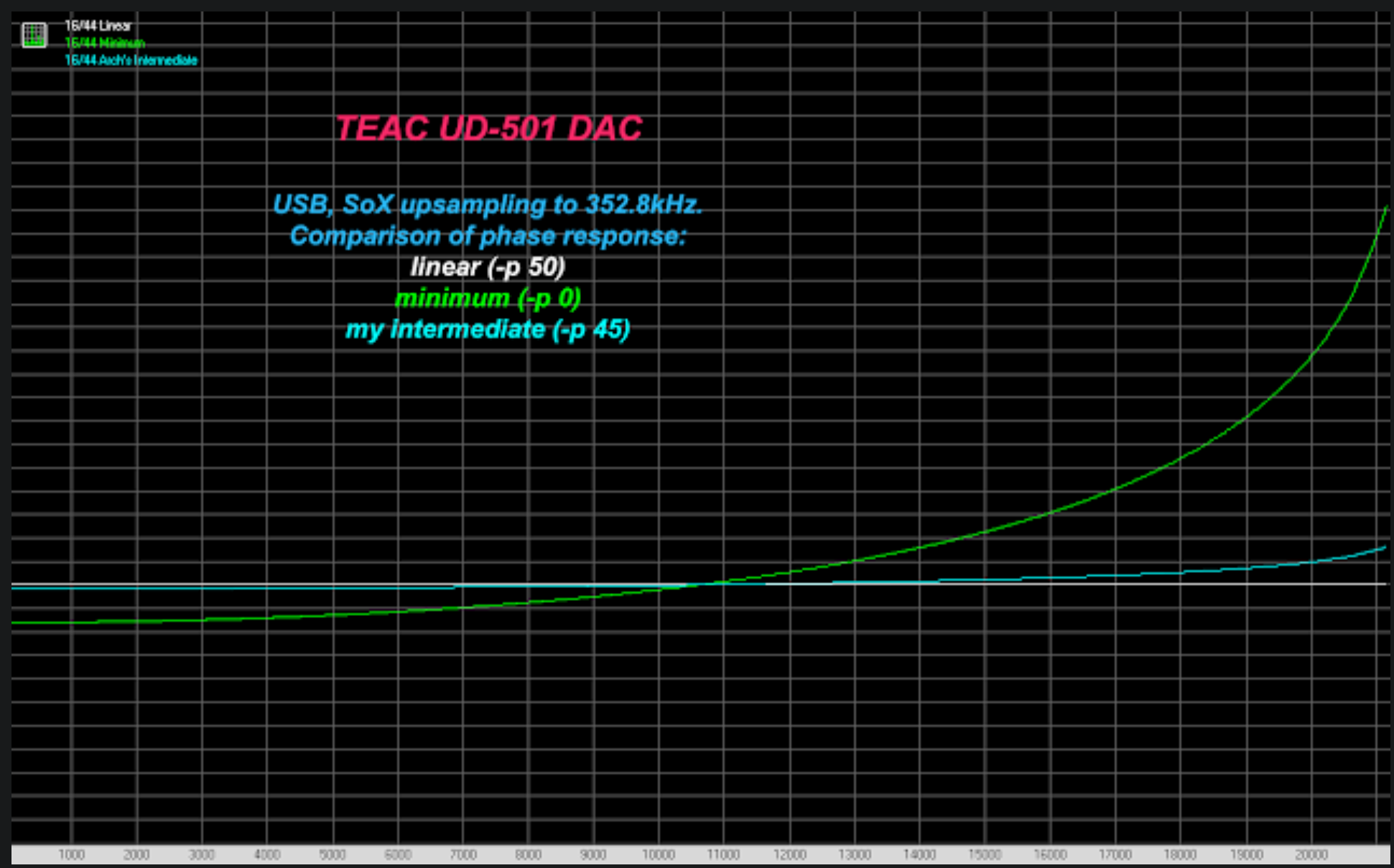 Ich hab leider keine bessere Darstellung gefunden. Stell dir hier eine Linie zwischen der weißen und grünen für den hybriden Filter vor. Im Verlauf von 20 Hz bis 20000 Khz wird die Phase vom Signal um mehrere Dutzend Grad gedreht. Transienten liegen so nicht mehr ideal mit ihren enthaltenen Signalen aufeinander und es wird etwas schwammiger, scheinbar.