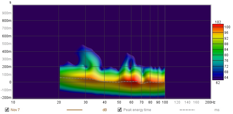 der Nachhall sieht nur wegen der Skalierung so harmlos aus, die Hauptmode bei 33Hz läuft eher 600ms für -30dB