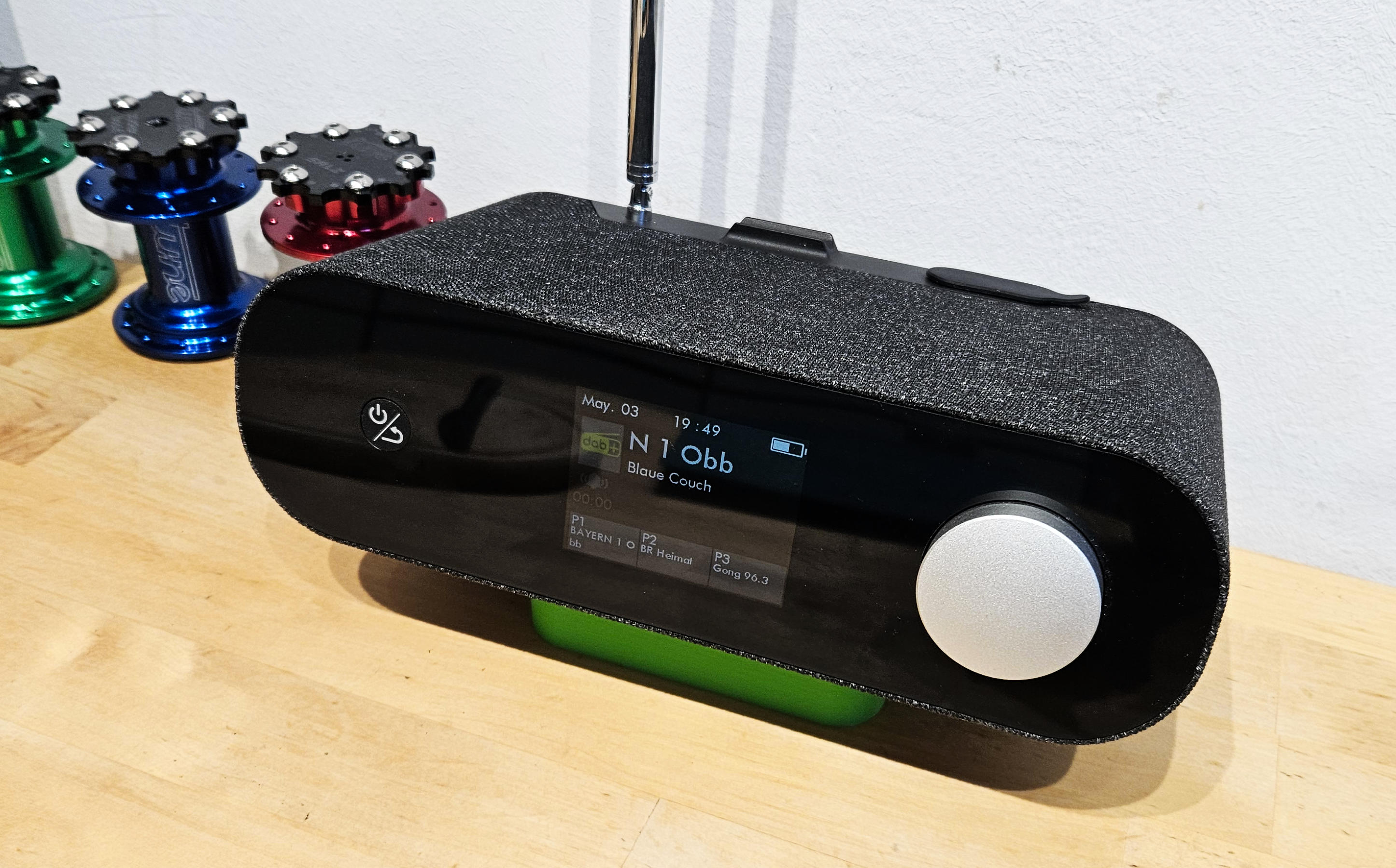 Rückenlage: Den NuGo kann man ja nicht nur wie bislang gezeigt in Bauchlage auf die Base legen, Rückenlage geht ebenso perfekt. In der Rückenlage ergibt sich ein ganz anderes, nicht minder interessantes Klangbild, welches sich wieder der normalen Wiedergabe mit hellerem Mittel Hochton annähert. Gut UKW geht dann nur eingeschränkt und die Anschlüsse sind nicht erreichbar. Vor allen Dingen steht das Display aber Kopf. Dennoch und vielleicht findet der Entwickler ja inn naher Zukunft einen Weg um im Menü für die Anzeige noch eine Option für eine 180 Grad Drehung vorzusehen.