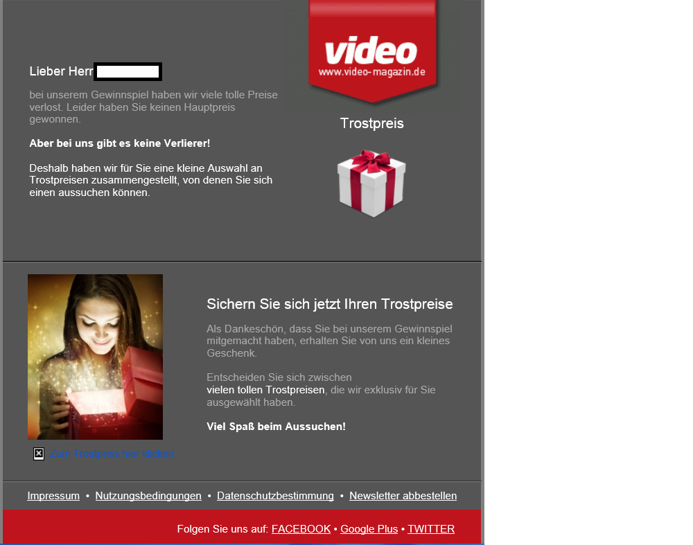 blablabla.....Leider haben sie keinen Hauptpreis gewonnen.