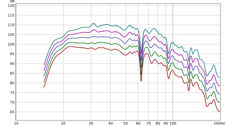 Unterhalb 40 Hz sind die Kurven deutlich unterschiedlich, man sieht, dass der Tiefbass bei höheren Pegeln komprimiert ist.
