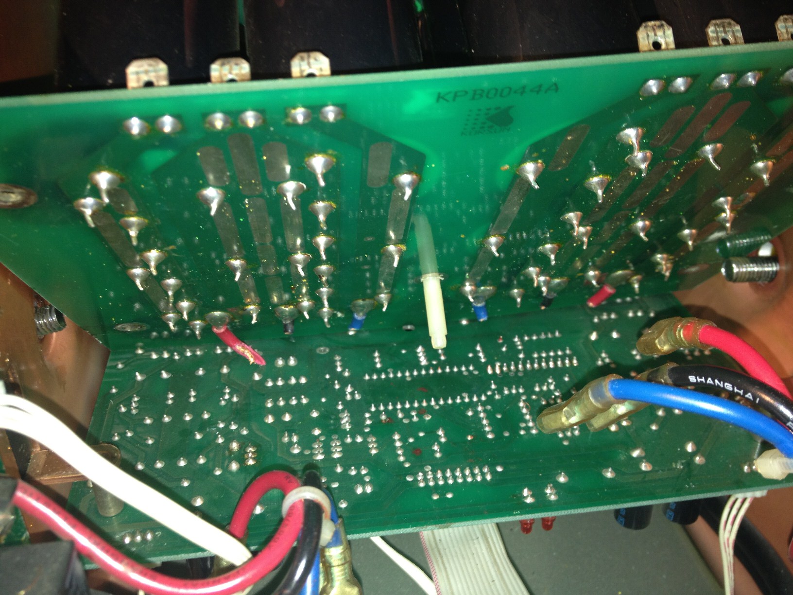 Ich hatte kurz Zeit das Board auszubauen (nicht ganz, aber so dass man von unten und oben hinsehen kann - der Bolide ist zwar einfach aufgebaut, aber um das Modul auszubauen muss ich die zwei Trafos und zwei Seitenwände und die Kühlrippen abmontieren).