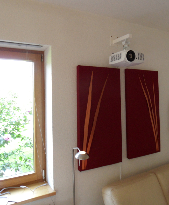 Es war meine liebe Schwiegermutter, die beim Betreten des Raumes und in Augenscheinnahme der frisch aufgehängten stoffbespannten Absorber gefragt hat: Was sind das für Wandkissen ?