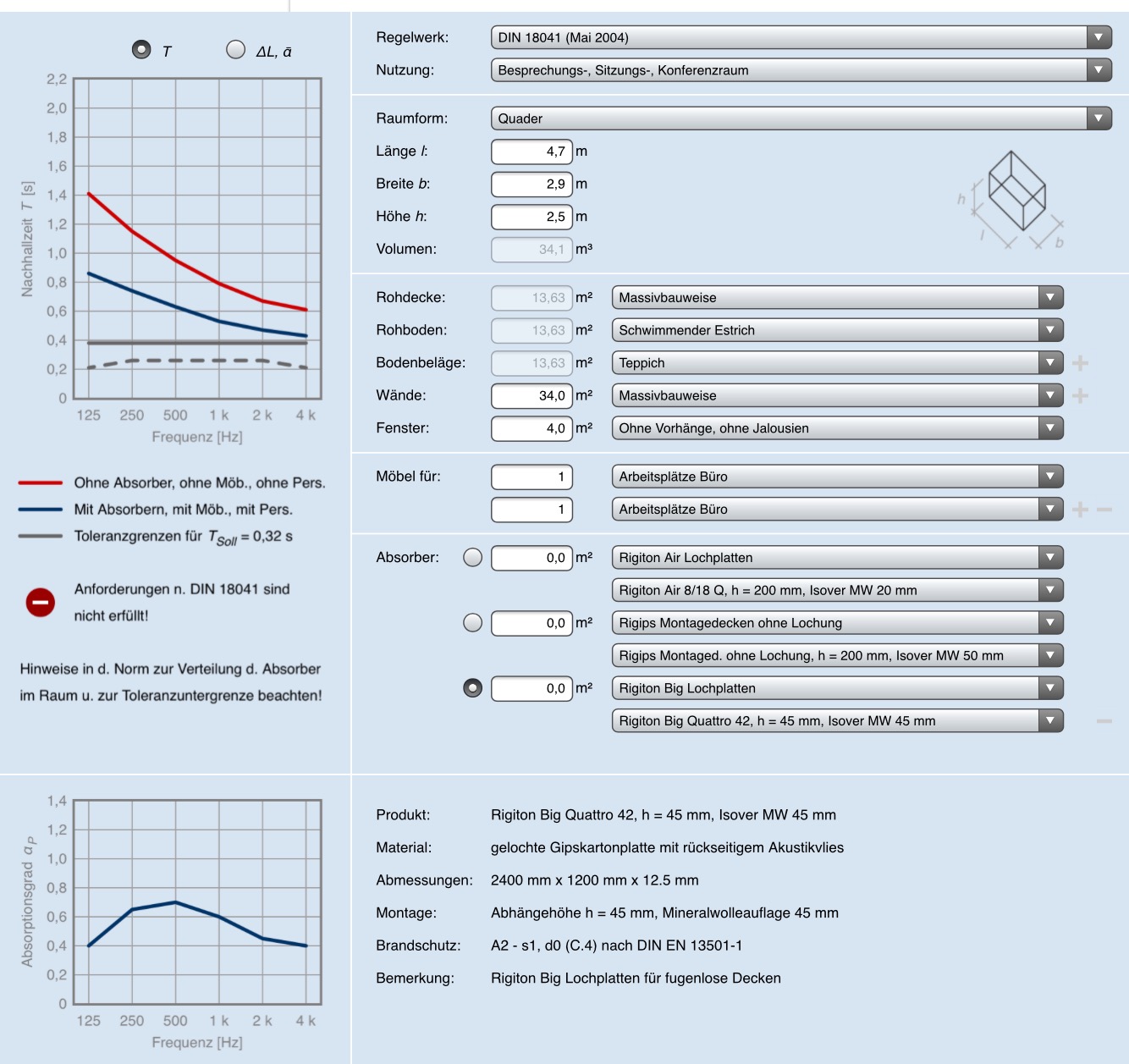 C. Jetzt Nachhall prüfen (siehe 2). Auch hier wieder: Was kann ich tun, was will ich tun? Die Maßnahmen an den Erstreflexionen einfach etwas üppiger dimensionieren? Deckensegel? Wird für die Bereiche >150Hz das pragmatischste sein. Nachhall senken geht v.a. über die Fläche.