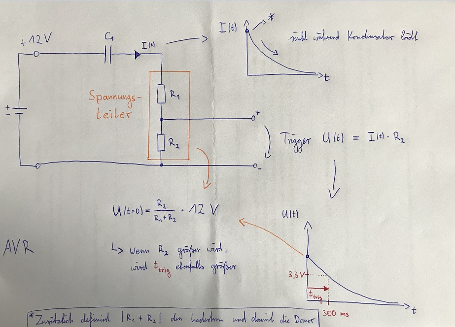 Optimierung wär, zwei Dioden vorzusehen. So wird der Kondensator nach Ausschalten des AVR entladen, ohne dass erneut eine (jetzt negative) Spannung am Trigger-Input anliegt.