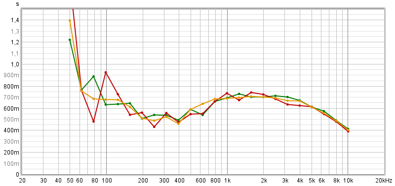 Hier noch RT60, da ich zum Nachhall, soweit ich mich erinnere für das Wohnzimmer noch kein Diagramm online gestellt hatte. Bestätigt jedenfalls die von dir angesprochene Korrelation.