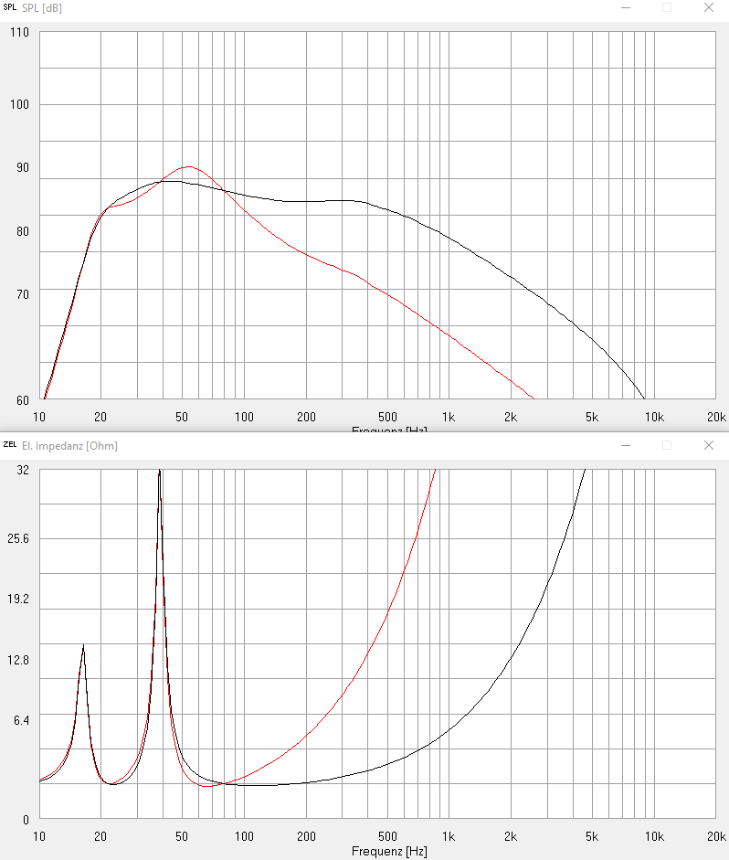 Allerdings verkraftet sie von der Bassreflexabstimmung her deutlich tiefere Frequenzen. Man muss nur maximal 6,6 dB draufpacken, und schon schafft sie 25 Hz/-3 dB statt der "unspektakulären" 37 Hz: