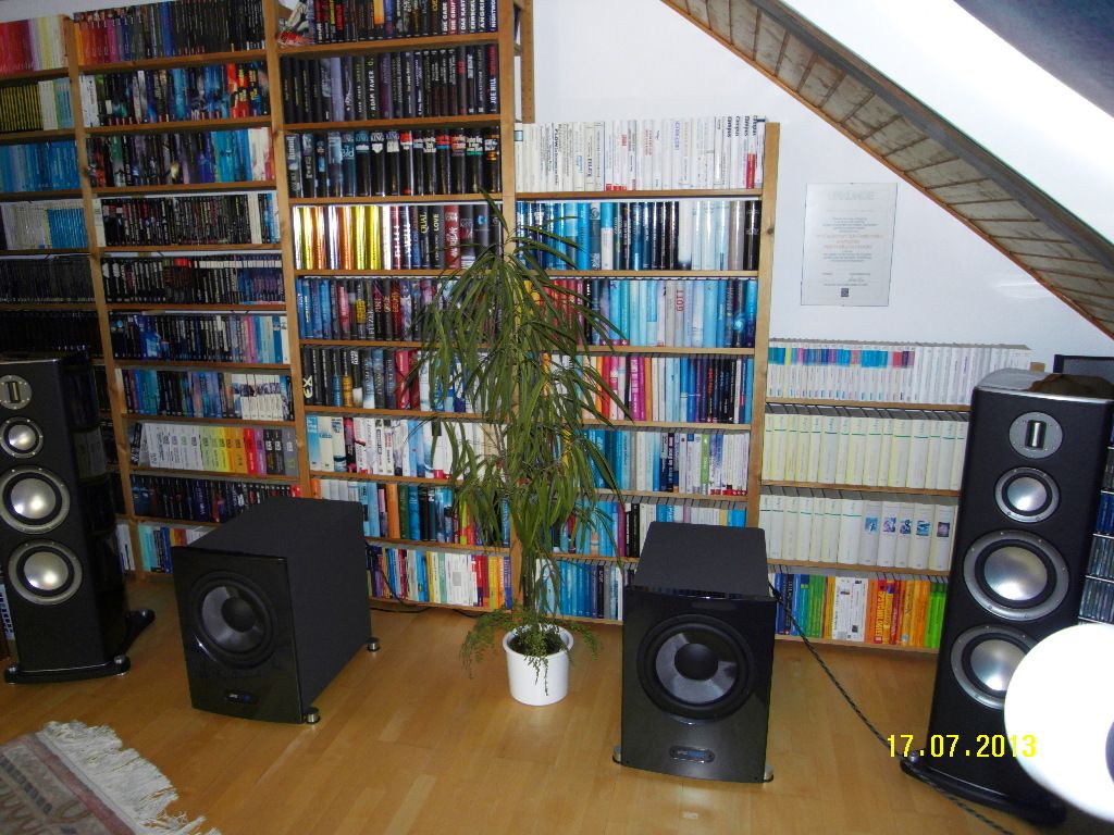 Groß zum Testen bin ich noch nicht gekommen, da ich nur ein längeres Sub-Kabel habe. Irgendwie hat es nicht richtig geklappt, dass ich per Y-Weiche am Ende des Subkabels abgezweigt bin. Endweder, war das Signal zu schwach, oder irgendwo war der Wurm drin. Am Ende habe ich dann mein kurzes 2,5m-Kabel quer zum AV gelegt. Das Kabel beim rechten Sub, welches da so quer hängt, hat dann gerade so von der Länge gereicht. Auf jeden Fall ging es dann.