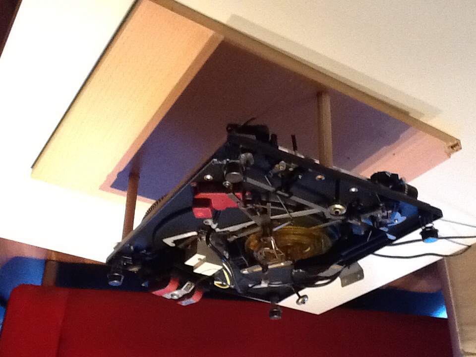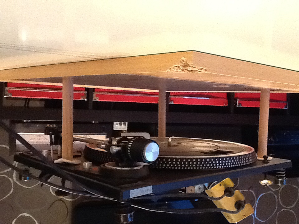 Einfach ein Brett mit drei Langen Holzdübeln als Auflagepunkte, auf denen der Plattenspieler kopfüber ruht, so dass ich arbeiten kann.