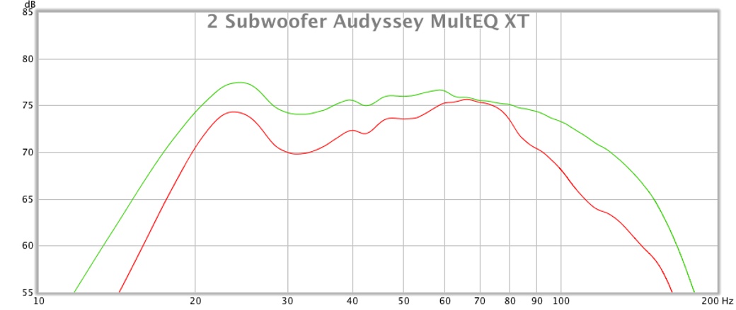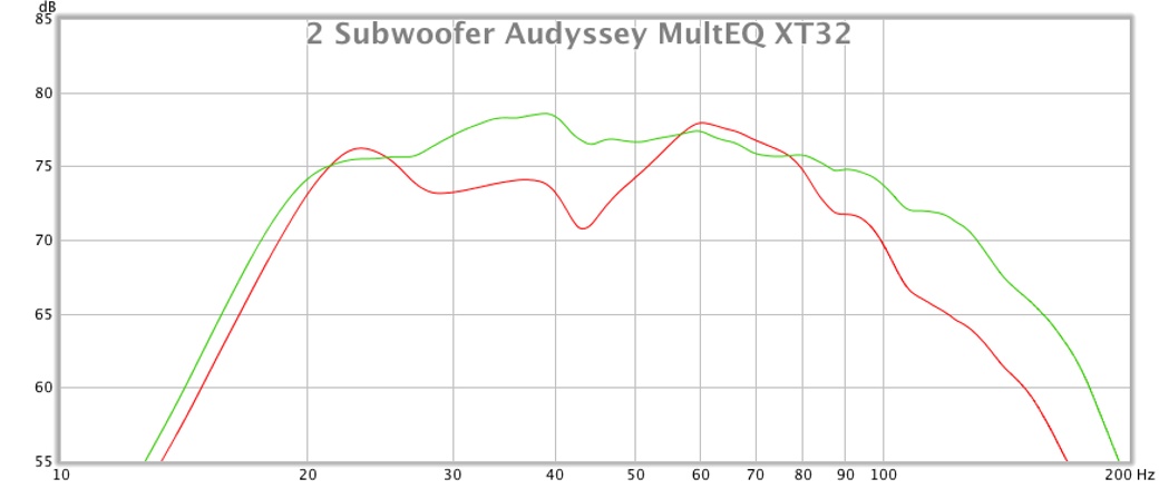 Daraus resultiert auch der kleine Buckel bei 28-43 Hz. Der mit nur einer Messung, oder mehreren Messungen am selben Ort "glatt" wäre. 2 Subwoofer Audyssey MultEQ XT vs. XT32