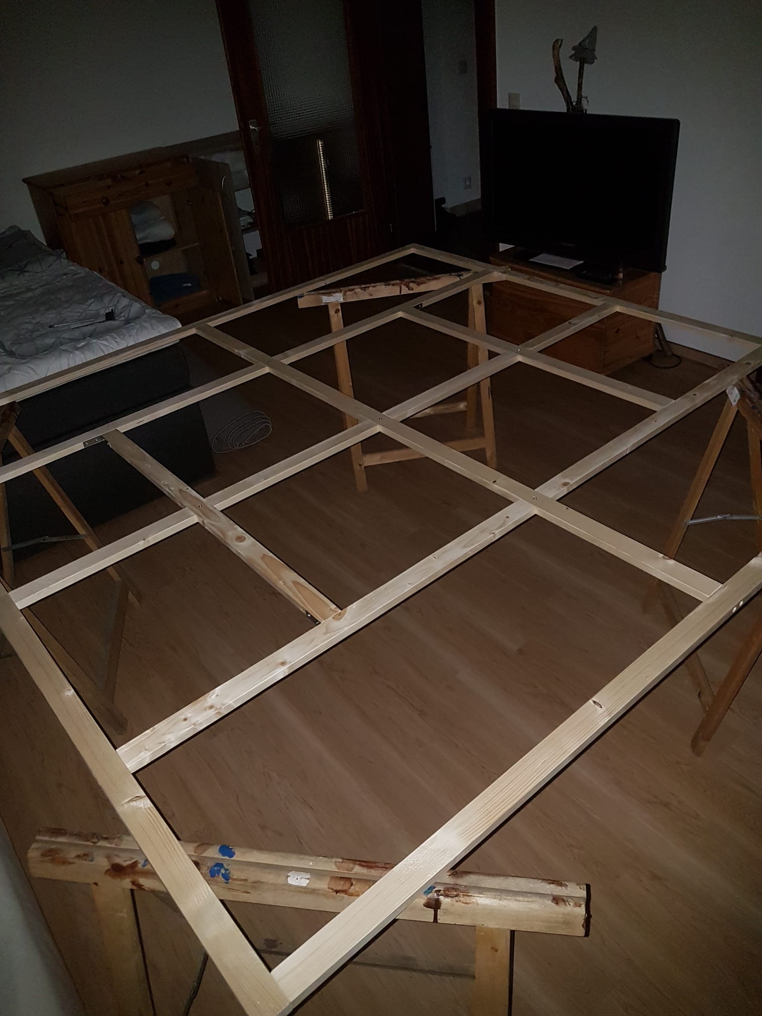 Dann auf der Unterseite die Basotect mit Fase am Holzrahmen aufgeklebt, und bei jeder Platte in der Mitte einen kleinen Kleks Kleber so 1cm Durchmesser aufgetragen, dann kann sich die Platte an der Oberen (einhalten ) und hängt nicht durch.