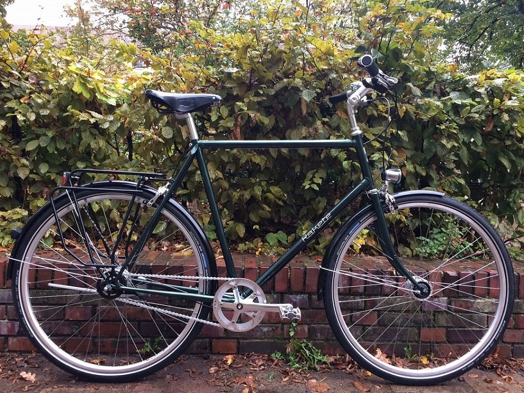 Oh, sehr hübsch. Und sehr zweckmäßig, 8- oder 11-Gang-Nabenschaltung, gutes LED-Licht, solide Bremen, schöner Ledersattel, brauchbarer Schutz für die Hosenbeine, guter Geradeauslauf. Da krieg ich Lust, mich direkt draufzuschwingen, nur die Reifen wären mir für unsere Straßenverhältnisse = viele Straßenbahnschienen zu schmal. Aber halt: Du bist offenbar ein ziemlich großer Kerl, lass mich raten, irgendwas über 60cm Rahmenhöhe sicherlich, auf dieses schöne Rad käme ich wohl nicht gut drauf. Aber das Rad fährt mit dem passenden Kerl drauf bestimmt so wie es heißt