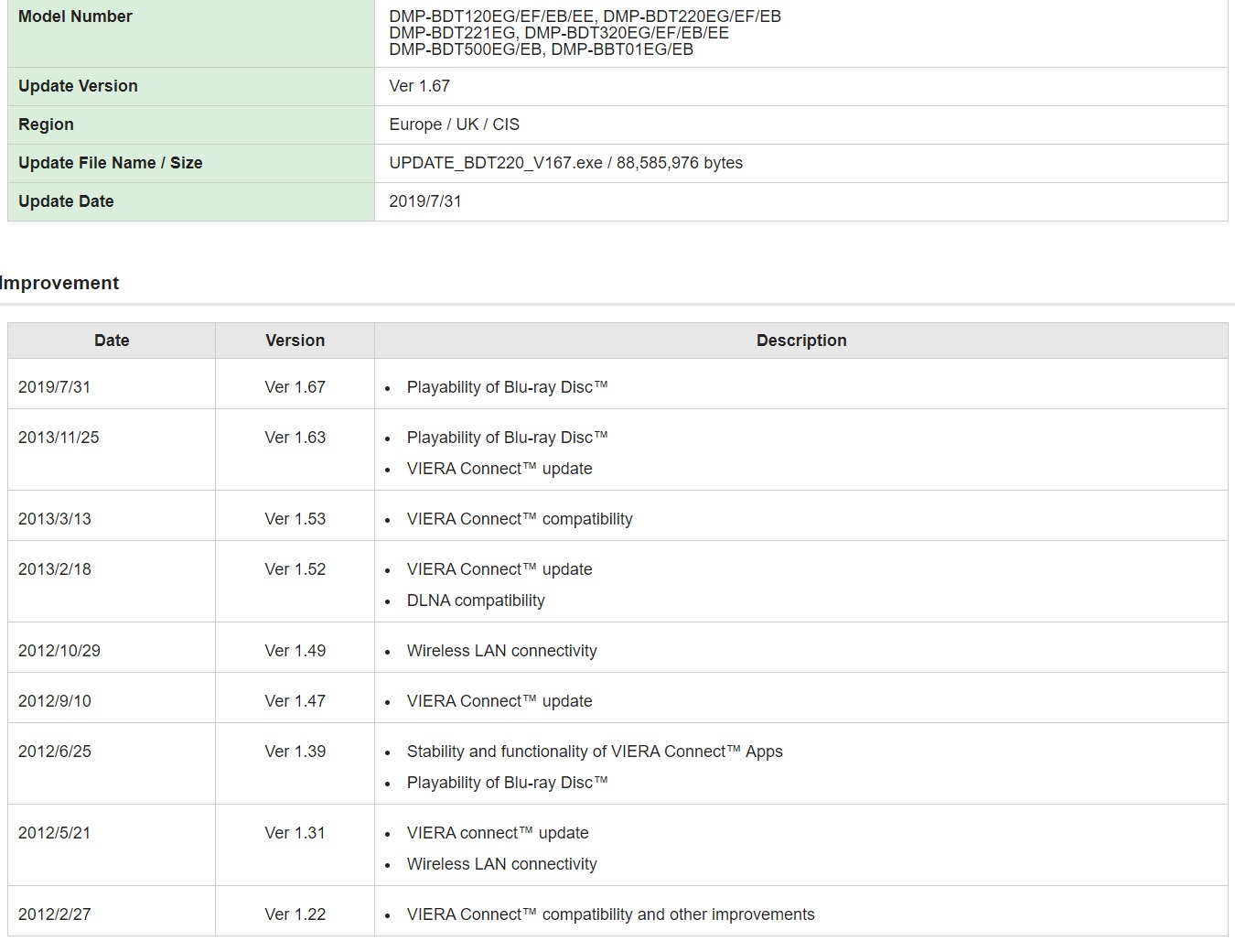 Edit: Hab hier im Anhang bspw. auch mal den Changelog von meinem alten BDT-500EG und den neuen UHD Playern von Panasonic (424/824/9004) rangehangen. Da sieht man halt, dass wie oft Firmwareupdates da irgendwelche Abspielprobleme fixen.