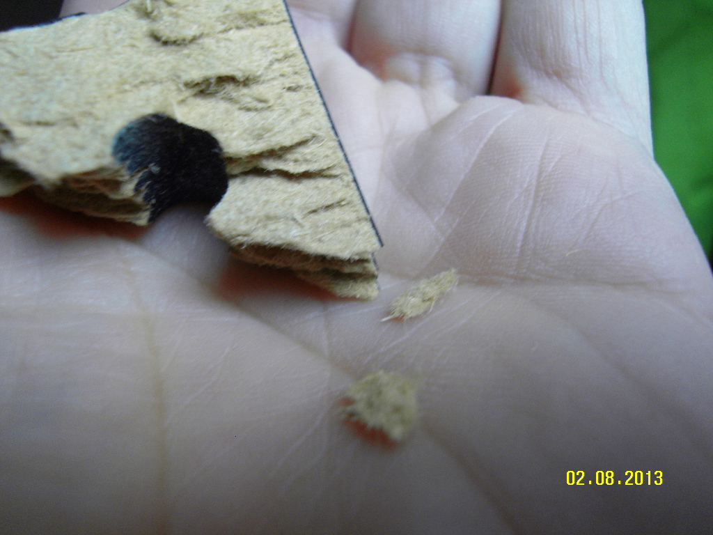 Hier ein Bild vom abgeplatzten Teil. Die einzelnen sichtbaren Fasern sind nicht steif, sondern wie Pappe biegbar. Ich bin aber kein Schreiner und kann dies nicht wirklich beurteilen. Wenn ich aber leicht an den Fasern reiße (Bild 1), lösen diese sich auch leicht. Es sieht nach Pappe aus und fühlt sich auch so an. Wenn dies eine MDF-Platte ist, dann sorry, dann ist es eben eine MDF-Platte. Relativ weich ist dieses Teil trotzdem. Und auf die Kante würde ich ihn nicht stellen wollen.