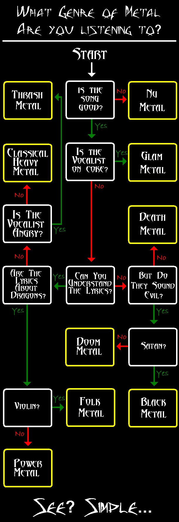 Das ist ganz einfach.NoFate hat geschrieben: So 9. Apr 2023, 17:36als ich mit der Musik anfing, gab es Rock, Hardrock und Heavy Metal. Dann kam Speed-, und Thrash Metal dazu. Dann Death, Black, White, Glam, und was weiß ich noch ales.... heute blicke ich da echt nicht mehr durch und versuche es auch schon gar nicht mehr