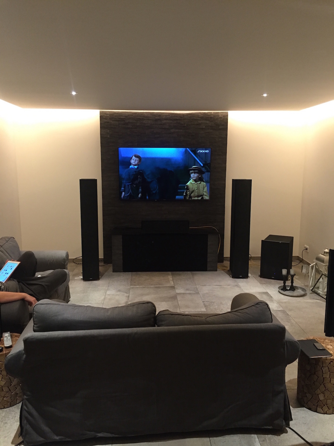 Rechts und links dann zwei kleine Sub neben das "Mittelpodest" und die selben auf die Rückseite des Raumes. Die beiden hinten Subs können dann auch hinter oder neben dem Sofa aufgestellt werden.