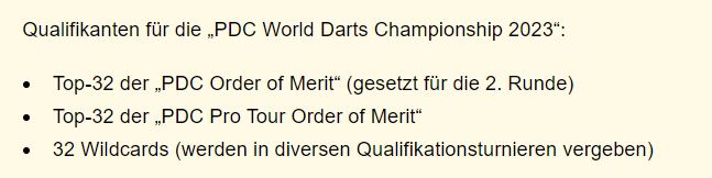 Die PDC ist aber auch ziemlich Pipi Langstrumpf mäßig drauf: Eigens für Frau Sherrock änderte man schnell noch die Quali-Regeln für die WM-Teilnahme. Nicht dass ich sie nicht gerne sehen würde (ihre Spiele sind meist ein Augenschmaus), doch kann ich das nicht wirklich nachvollziehen. Hätte man das schon vor 6 Monaten getan, hätte es jetzt nicht ein solches "Geschmäckle".