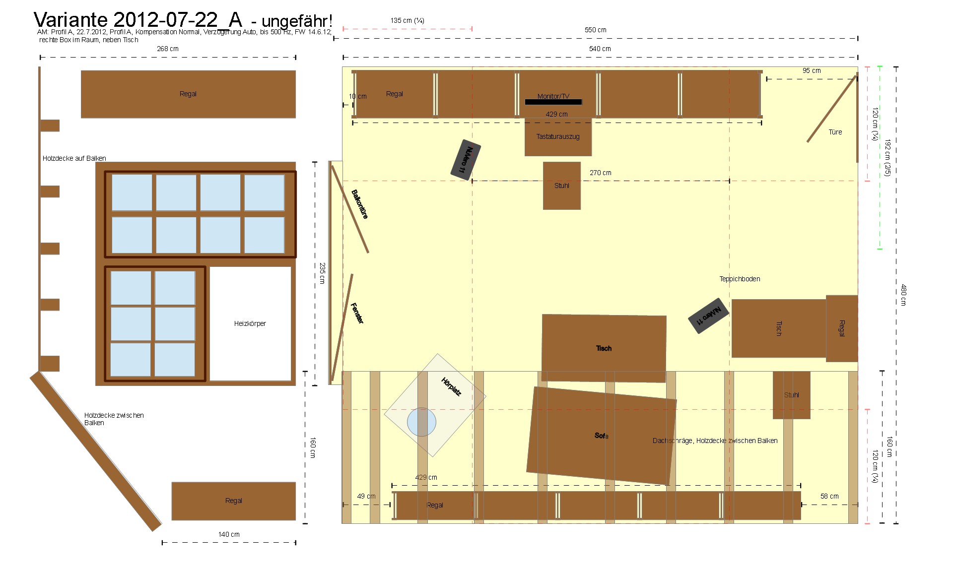 Eine weitere Variante wäre vielversprechend, leider schwierig umzusetzen: eine Erhöhung des Hörplatzes. "In der Höhe" klingt dieser Raum völlig anders als auf Sitz-Hörhöhe, zumindest unter der Dachschräge und 1 - 2 Meter in den nicht-schrägen Bereich hinein.