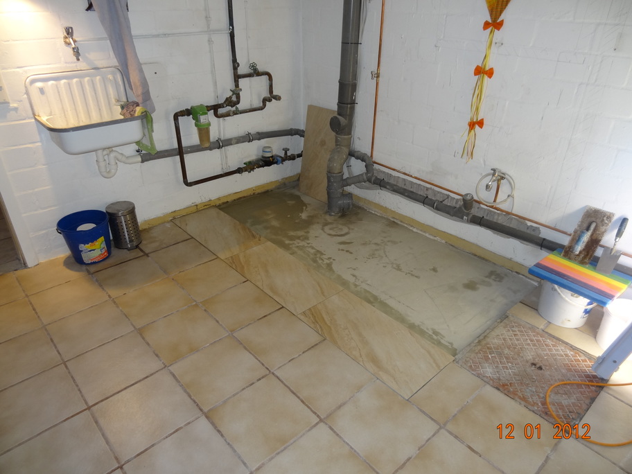 Nun geht es im Kino-Klo auch weiter. Aber da ich dennoch viel unterfüttern musste , sind diese Monsterfliesen nicht so schnell gelegt. Bin ja kein Fliesenleger , der macht wohl so was mit Links.