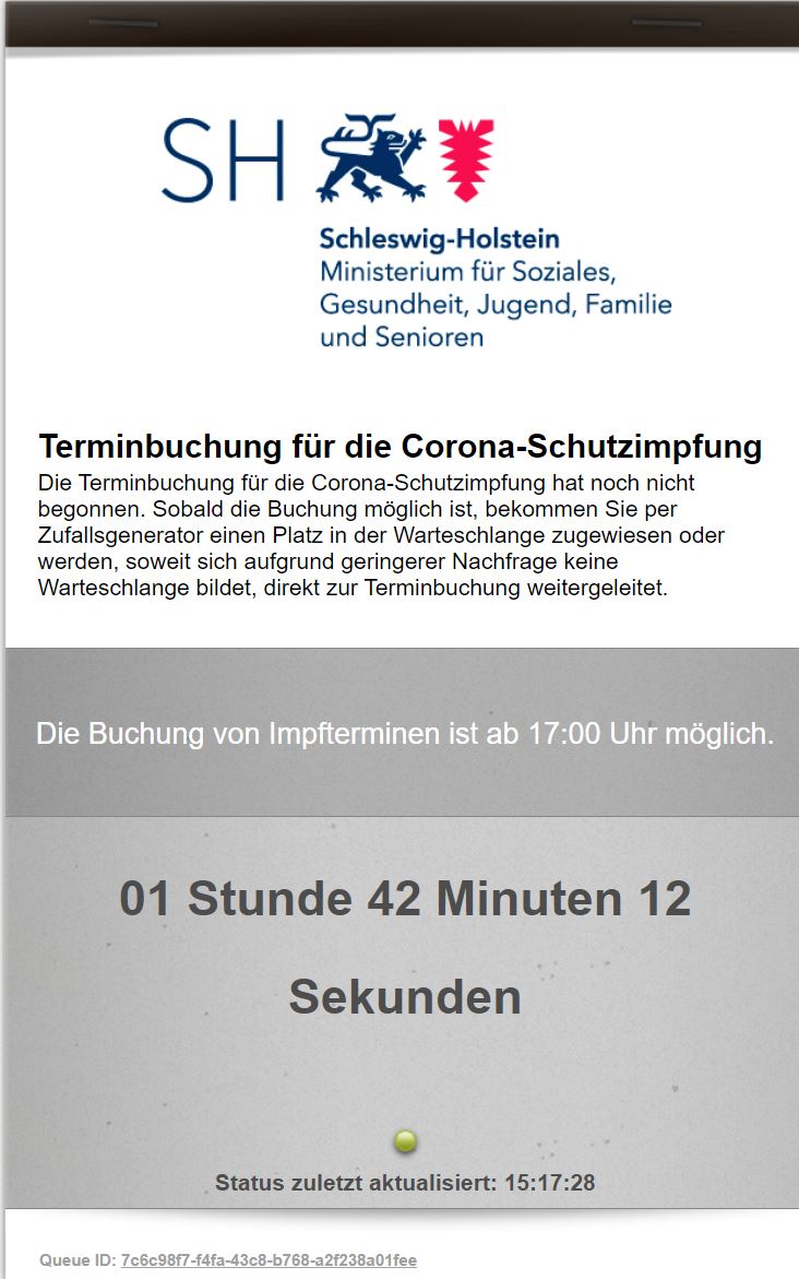 In Schleswig Holstein ist diejenige Seite, über die sich Berechtigte der Stufe 3 ab heute 17:00 Uhr eine Terminbuchung organisieren können, jetzt schon nicht mehr erreichbar.